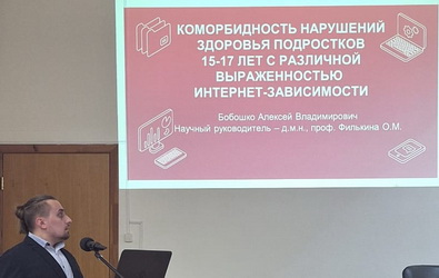 На II месте – аспирант 3 года обучения по научной специальности Педиатрия Бобошко Алексей Владимирович с докладом на тему «Коморбидность нарушений здоровья подростков 15-17 лет с различной выраженностью интернет-зависимости».