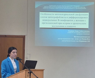 На III месте – аспирант 3 года обучения по научной специальности Акушерство и гинекология Хизриева Заира Сайпутдиновна с докладом на тему «Особенности митохондриальной дисфункции клеток цитотрофобласта и дифференцировка децидуальных В-лимфоцитов у женщин с преэклампсией».