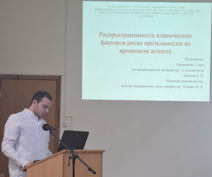 на первом месте – ординатор 2 года обучения по специальности Акушерство и гинекология Набиев Бабалы Натигович с докладом «Распространенность клинических факторов риска преэклампсии во временном аспекте»;