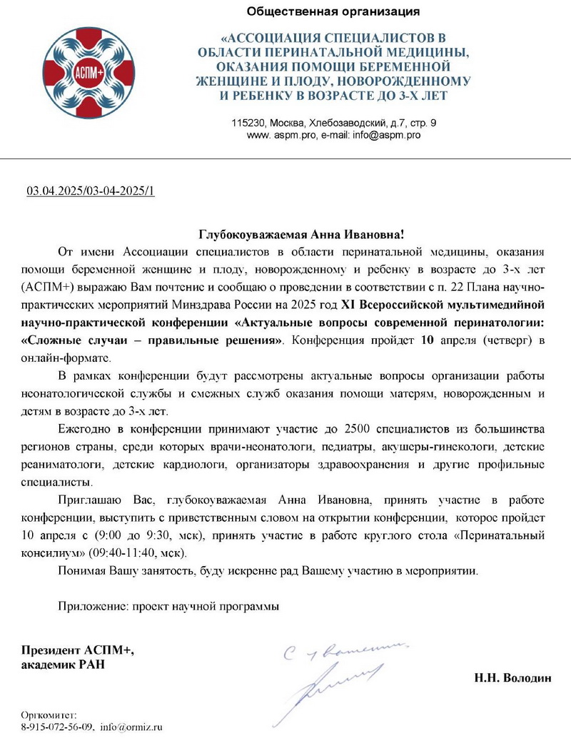 Направляем обращение академика РАН Н.Н. Володина с приглашением на имя Анны Ивановны принять участие в работе XI Всероссийской мультимедийной научно-практической конференции «Актуальные вопросы современной перинатологии: «Сложные случаи – правильные решения» 10 апреля.Проект программы