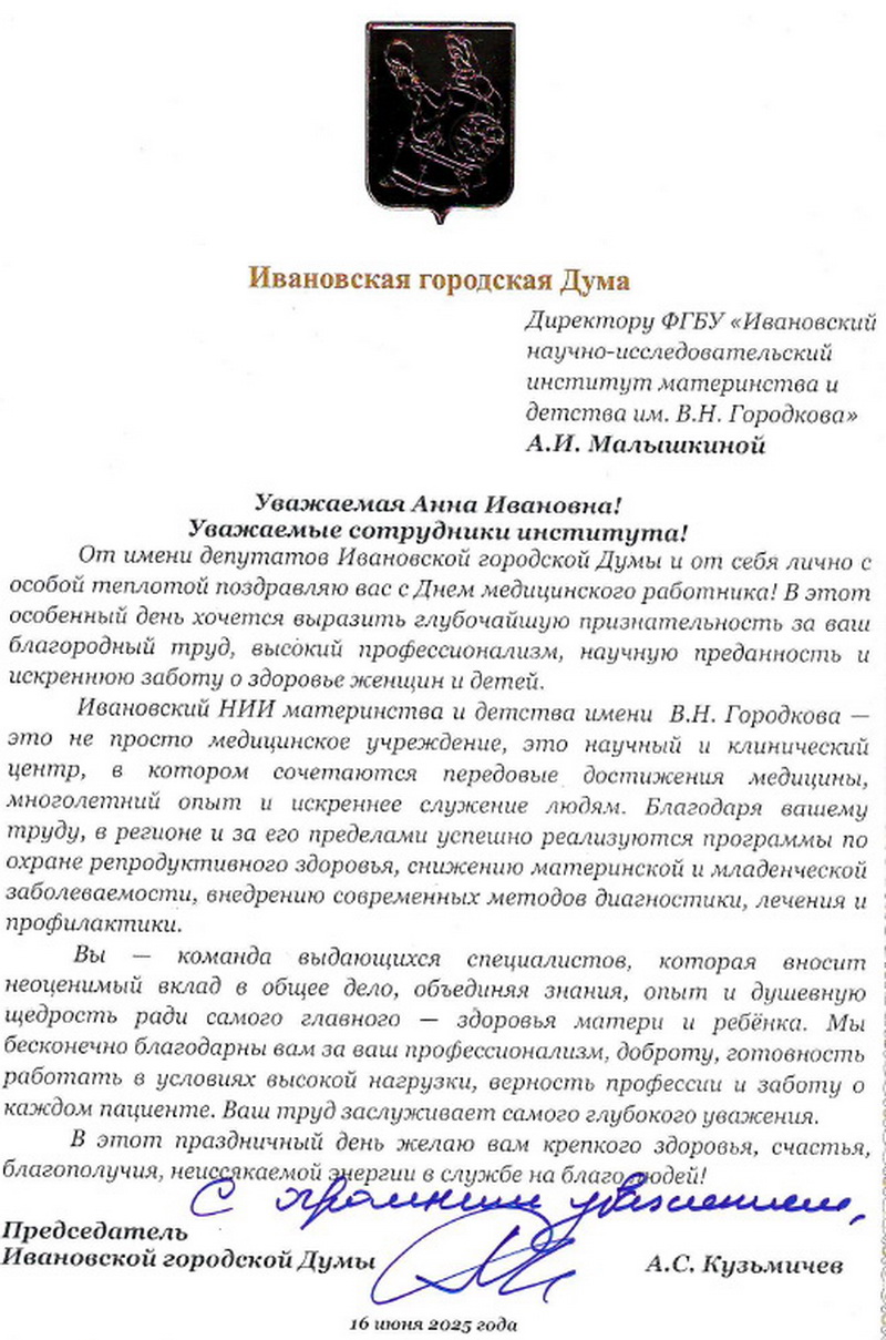 Институт продолжает получать поздравления с Днем медицинского работника. Поступило благодарственное письмо от Председателя Ивановской городской Думы