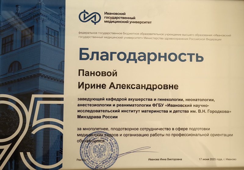 Многие годы сотрудниками кафедры нашего Института участвуют в проведении профориентационных мероприятий для студентов лечебного и педиатрического факультетов ИвГМУ. За многолетнее, плодотворное сотрудничество в сфере подготовки медицинских кадров и организацию работы по профессиональной ориентации обучающихся д.м.н., проф. Пановой Ирине Александровне была вручена благодарность ИвГМУ .