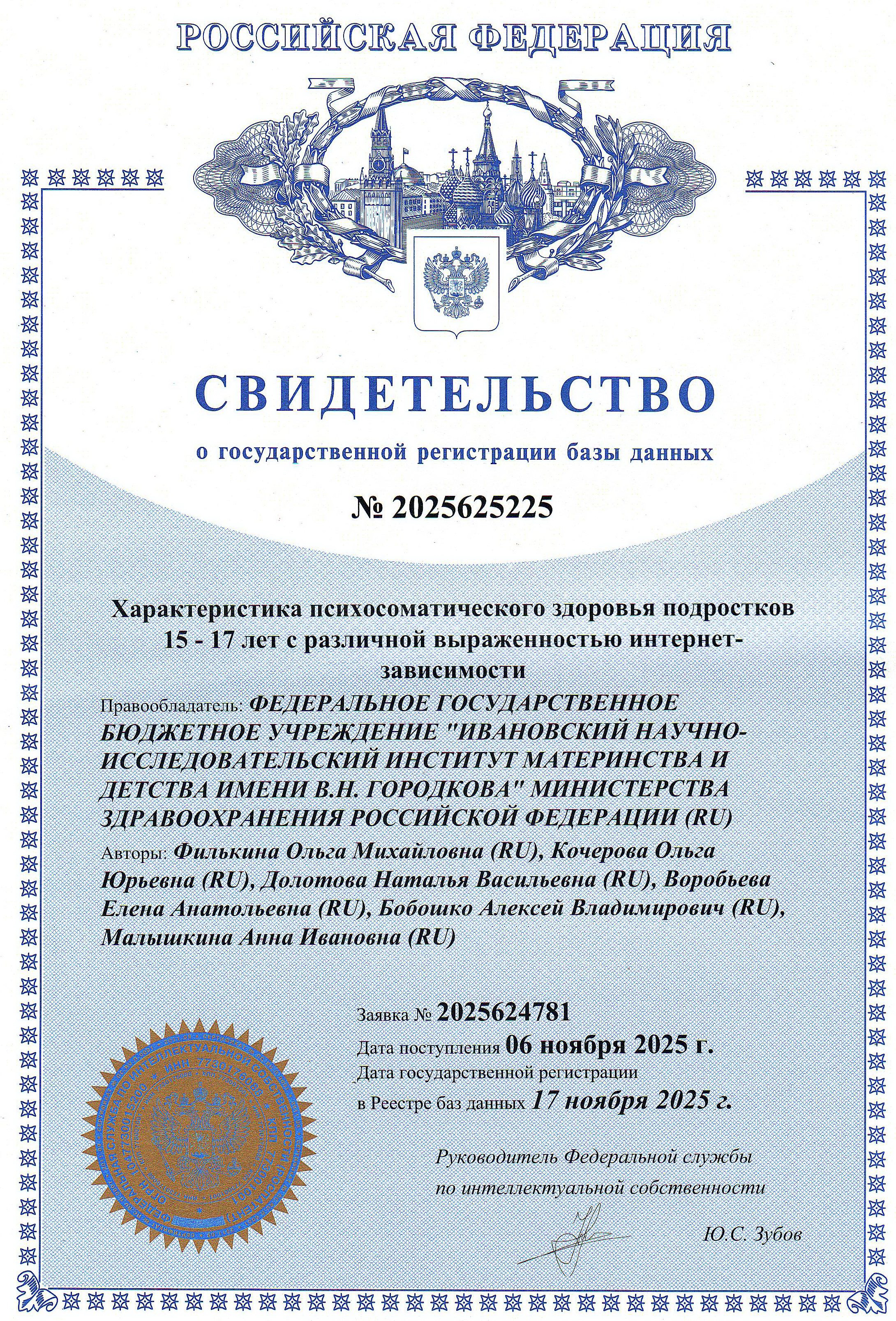 10 декабря 2025 года получено свидетельство о государственной регистрации базы данных «Характеристика психосоматического здоровья подростков 15-17 лет с различной выраженностью интернет-зависимости», авторы: Филькина О.М., Кочерова О.Ю., Долотова Н.В., Воробьева Е.А., Бобошко А.В., Малышкина А.И. (Свидетельство № 2025625225, дата регистрации 17.11.2025 г.).