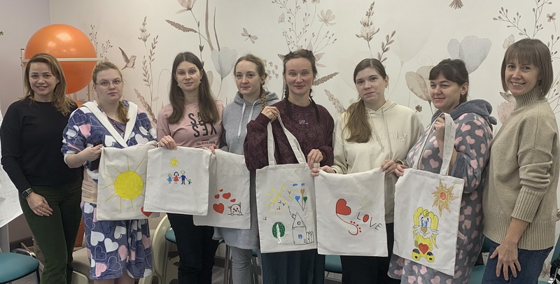 Участницы совместно с представителями компании «Байер» занимались росписью шопперов (текстильных сумок). Данный формат был выбран как акт релаксации и творческого выражения, способствующий достижению душевного покоя. Работа с цветом, формами в непринужденной обстановке позволила женщинам переключить внимание, снизить уровень стресса и получить положительные эмоции. Все необходимые материалы (холщовые сумки, краски, кисти) были предоставлены компанией «Байер». Занятие прошло в доброжелательной и доверительной атмосфере. Участницы проявили высокую заинтересованность, активно задавали вопросы, особенно в части послеродовой депрессий, а также техникам мгновенного снятия тревоги. Практическая часть была встречена с энтузиазмом, способствовала раскрепощению и неформальному общению. Женщины отметили, что подобные интегративные занятия (теория + практика) очень полезны и помогают не только получить знания, но и почувствовать поддержку и снять напряжение.