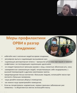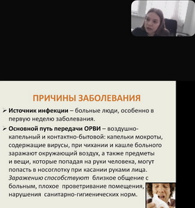 Сегодня, Екатерина Казначеева ординатор второго года обучения, подробно на вебинаре рассказала школьникам об индивидуальных, общих профилактических мероприятиях ОРВИ, проводимых дома, в школе, в поликлинике.