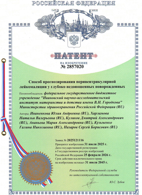 16 марта 2026 года получен патент на изобретение «Способ прогнозирования перивентрикулярной лейкомаляции у глубоко недоношенных новорожденных», авторы: Иваненкова Ю.А., Харламова Н.В., Куликов Д.А., Ананьева М.А., Кузьменко Г.Н., Назаров С.Б. (патент № 2857020, дата регистрации 25.02.2026 г.).