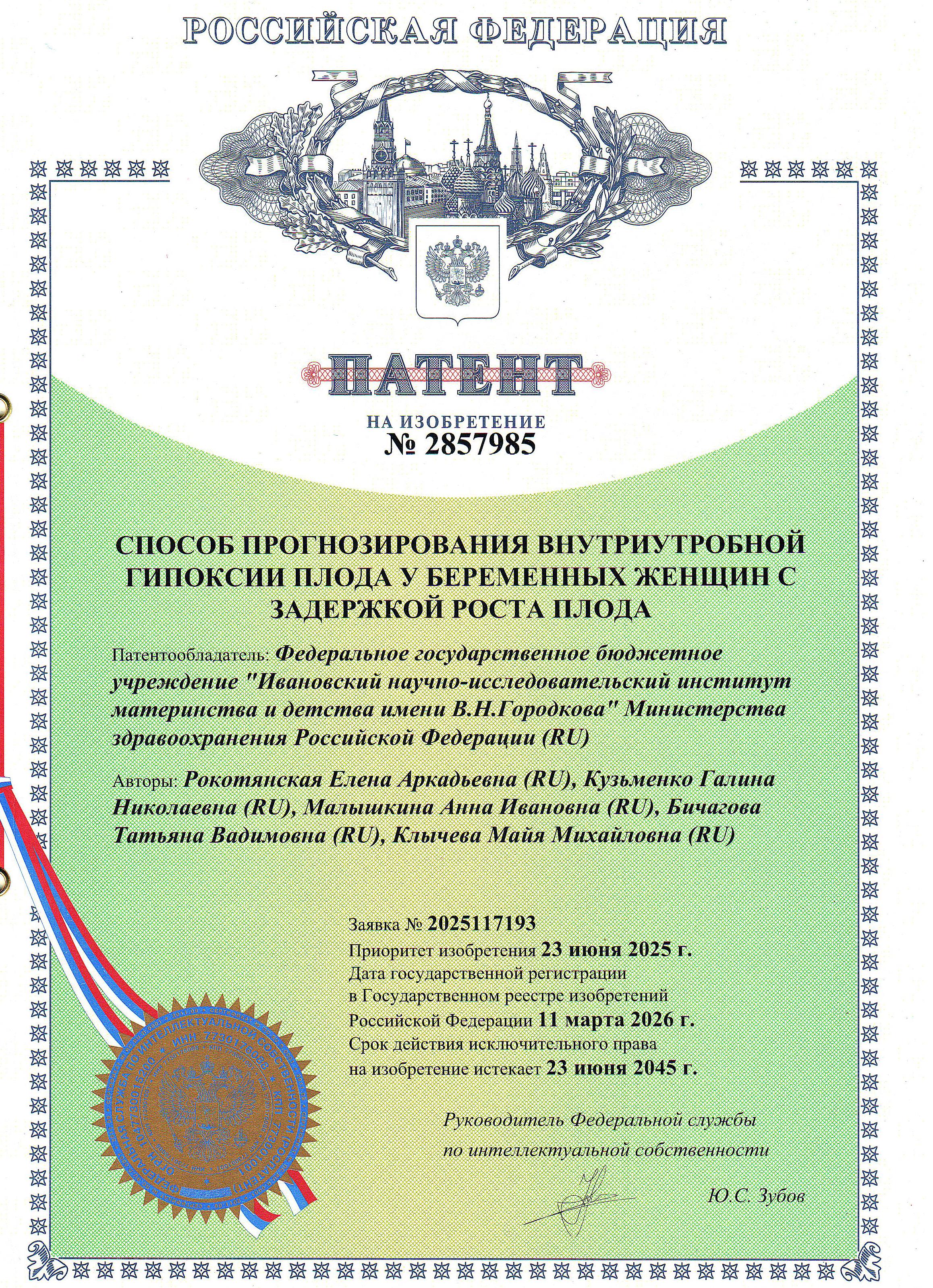 1 апреля 2026 года получен патент на изобретение «Способ прогнозирования внутриутробной гипоксии плода у беременных женщин с задержкой роста плода», авторы: Рокотянская Е.А., Кузьменко Г.Н., Малышкина А.И., Бичагова Т.В., Клычева М.М. (патент № 2857985, дата регистрации 11.03.2026 г.).