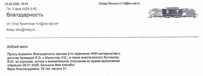 Спасибо всему медицинскому персоналу Ивановского НИИ Мид Минздрава России за хорошее отношение, помощь, внимательность.